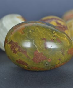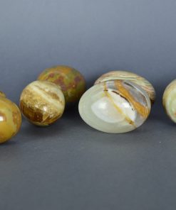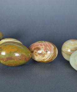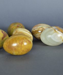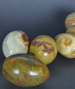 Prachtige, glanzend gepolijste sfeervolle decoratieve eieren, met woeste patronen en lijnen, in hoofdzakelijkgeel oker en groenbruine aardetinten. In de edelstenen; jaspis en agaat.