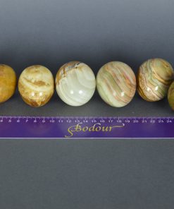 De opgegeven afmeting is van de groenbruine jaspis, het grootste ei, 8 cm hoog. Het gewicht is van de zeven eieren samen.