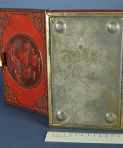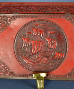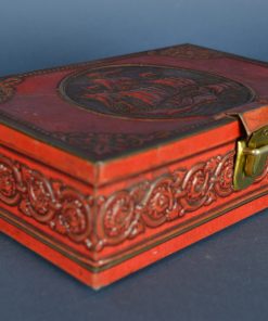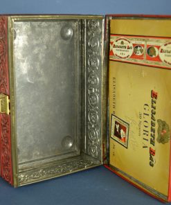 Fel rood Elisabeth Bas sigarenblik met bijzonder goudkleurig slotje, geheel van metaal. Het blik is gedecoreerd met een enkele goudkleurige bies rondom en fantasiemotieven in relief met op de deksel een V.O.C zeilschip op zee Het blik heeft aan de onderzijde 4 bolvormige pootjes. Gemaakt rond 1920.