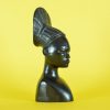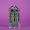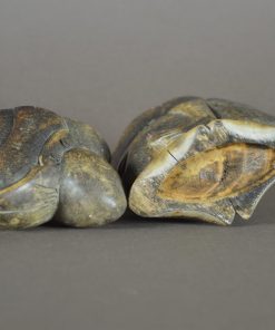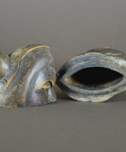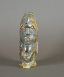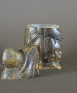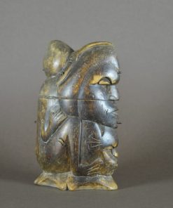 Bijzonder, vermoedelijk Afrikaans, sjamanen tasje voor kruiden of spreuken. De met de hand uitgesneden bewerkte houten koker laat drie figuren zien. Een zittende figuur houdt met zijn handen en voeten twee boven elkaar geplaatste gezichten bijeen die voor hem kijken. Het deksel en de koker hebben kleine metalen oogjes aan de weerszijden waardoor een touw of dunne ketting past. Het kan gedragen worden maar is ook een bijzonder object naar te kijken.