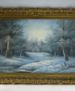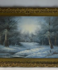 Stemmig sneeuwlandschap geschilderd in de stijl van de bekende kunstschilder Bob Ross. Het toont een besneeuwd boslandschap met een riviertje. Het doek is ingelijst in een vrijwel onbeschadigde waanzinnige barokke vergulde antieke bewerkte houten lijst. De krullen zijn in gips gemodelleerd en verguld.