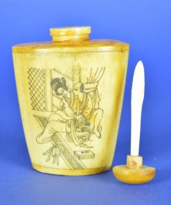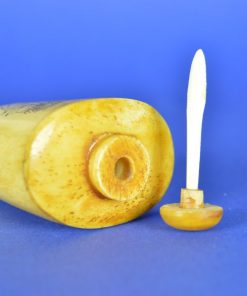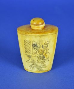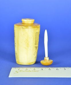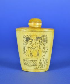 Dit curieuze Chinese parfum of snuifflesje is gemaakt van been en aan twee zijden voorzien van een ingegraveerde erotische voorstelling. Het flesje werd gemaakt voor tabak of parfum tussen 1910 en 1950. Het dopje met een lepelachtig stickje sluit het flesje goed af.