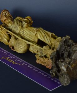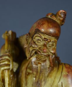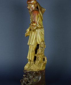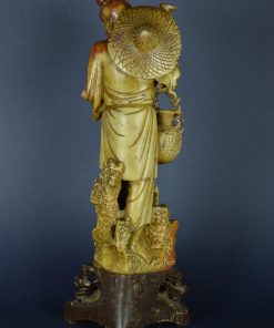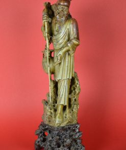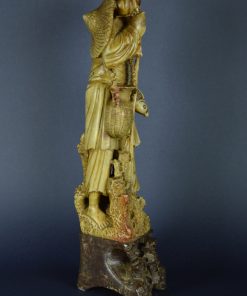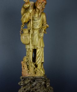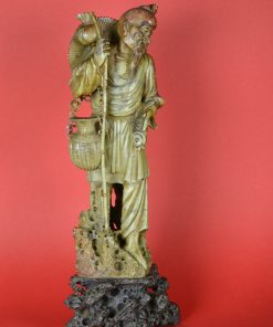 Prachtig gedetailleerd uit speksteen gehakt beeld van een Chinese visser. Hij draagt een lange baard, een rieten hoed op de rug, een mand aan een geringd hengsel, en een lange bamboestok met een dichtgebonden buidel. In de andere hand een vis. Het uit een stuk gemaakte beeld staat op een donkere sokkel. Gemaakt rond 1950.