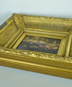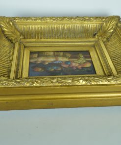 Prachtig stilleven met een kleurrijke rijk gedekte tafel als uit een sprookje van duizend-en-een-nacht. De schitterende intense kleuren van dit kleine, op paneel geschilderde kunstwerk zijn een feest om naar te kijken. Op de achterzijde de tekst: Biggs & Sons London. De lijst is uit hout gestoken en verguld met bladgoud. Gemaakt in de 20e eeuw.