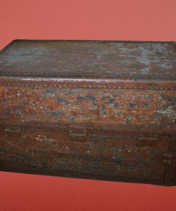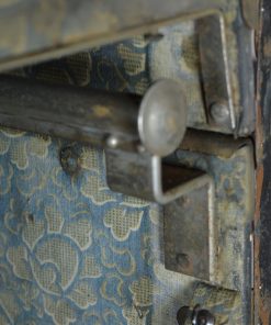 Waanzinnige stoomboot hutkoffer met originele reisstickers o.a. van de stoombootmaatschappij Holland America line, een label met ‘trans proof trunk, p.s.t. sorento, en in witte letters, ‘S.R. Tiemstra’. De antieke hutkoffer heeft vele reizen gemaakt maar zeker over de grote oceanen naar Amerika. Roestbruin geschilderd, over een grijs blauwe metaal kleur, is het interieur bekleed met wit gebloemde, turquoise textiel. De stof is gerafeld, er ontbreekt een plankje of mogelijk een laatje en het hanggedeelte is niet in optimale staat. De koffer is geur-neutraal. Hij kan in verticale positie worden gebruikt als vitrinekast voor mooie objecten, als bar of boekenkast. Hij kan helemaal,180 graden, worden opengeklapt, of half, in een hoek van 90 graden. Horizontaal geplaatst is het een prachtige solide koffietafel of bed einde tafel, waar heel veel in kan.