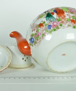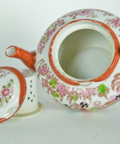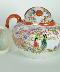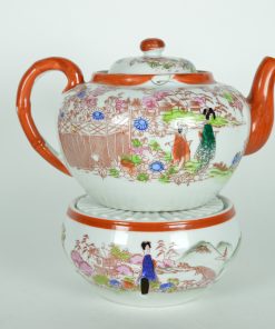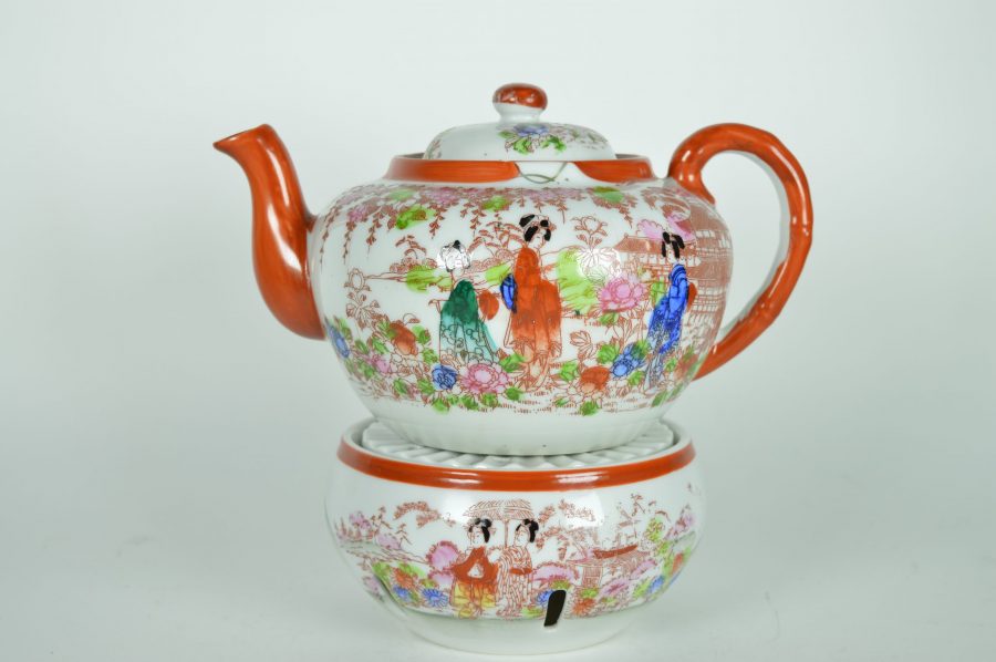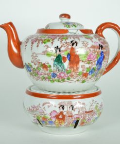 Mooi, strak vormgegeven theepot van Chinees porselein met een Japanse voorstelling. De decoratie toont drie geisha’s in een park met japanse bloesem en bloemen, ze zijn gekleed in respectievelijk een rode, blauwe en groene kimono. Op de achtergrond specifieke Japanse gebouwen van hout. De theepot is afgebiesd met een rode rand. Aan de onderzijde een karakter. Vermoedelijk geproduceerd rond 1950. Het theelicht is hier onder te bekijken.