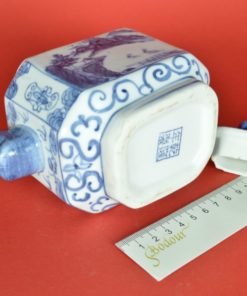 Bijzonder theepotje met een blauwe draak. Het handvat is een draak die zich met 4 poten in relief vasthoudt aan de pot, De tuit is een drakenkop waaruit de thee geschonken wordt. De buik toont een decor van een Chinees landschap met bergen en fantasiemotieven. Geglazuurd aan de buiten en onderzijde, niet aan de binnenkant. Tussen tuit en buikje zijn gaatjes aangebracht om theeblaadjes tegen te houden. Aan de onderzijde Aziatische karakters.