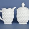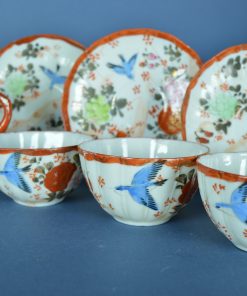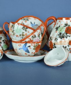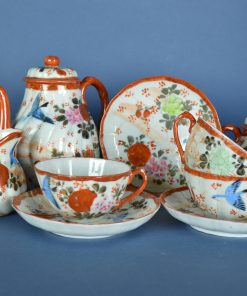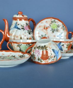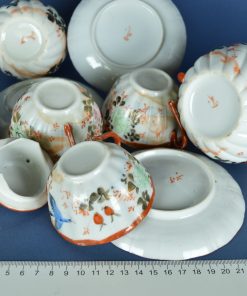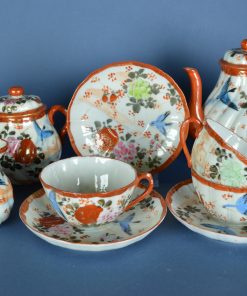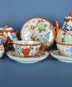Deze set bestaat uit een theepot, een melkkan een suikerpot met deksel, en drie kop en schotels. De opgegeven maat is die van de theepot. Diameter van een kopje is 8.5 cm.