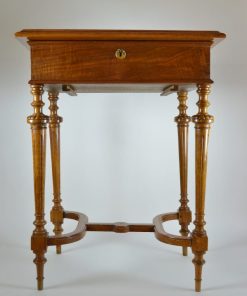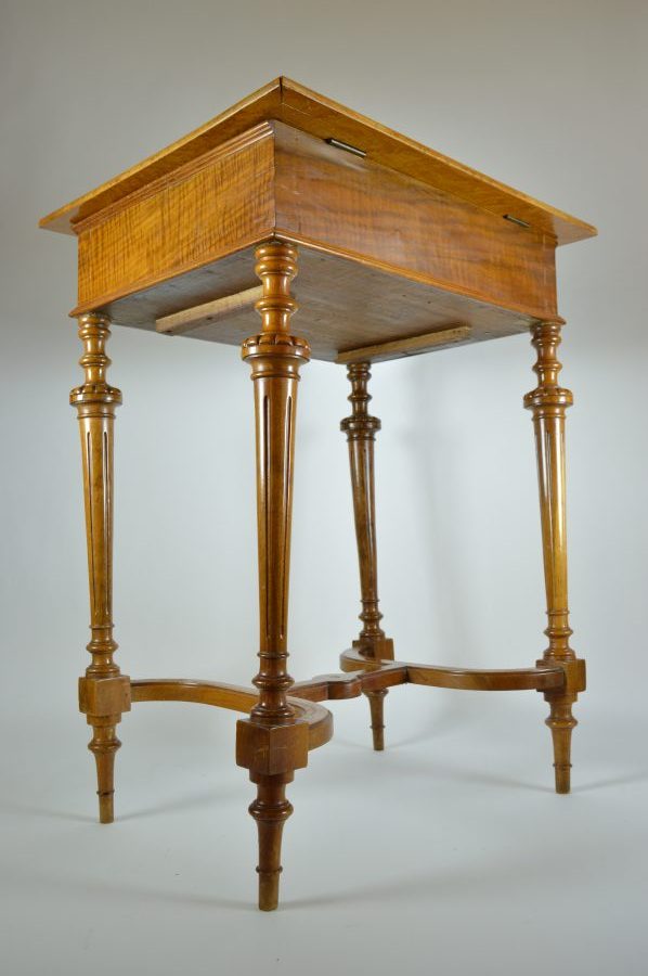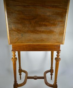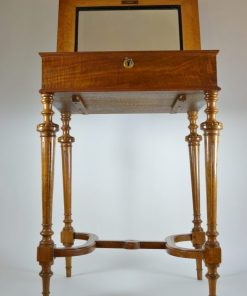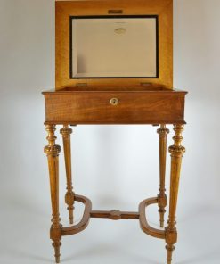 Dit bijzonder aparte, luxe en elegante toilettafeltje is gemaakt van licht, warm gekleurd wortelnotenhout. Het is vermoedelijk gemaakt tussen 1930 en 1950. Het tafeltje heeft een klep en een slot met sleutel. Opengeklapt heeft het een diepe ruime bergruimte voor toiletartikelen of sieraden. Het heeft een zware facet geslepen spiegel omzoomd met een donkere houten rand. Het tafeltje kan ook dienen als schrijftafel, elke stoel past er goed aan. Het massieve hout van de klep, de zware spiegel en het lichtere onderstel maakt de constructie minder stevig. In het midden van het onderstel ontbreekt een sierstuk, en aan de onderzijde van de tafel mist wellicht een blad. Het hout heeft op verschillende plaatsen gewerkt waardoor er hier en daar een barst is ontstaan. Desondanks heeft het heel veel sfeer en vrolijkt het elke ruimte op, of het nu met geopende klep in een hal staat of in een slaapkamer. Met geopende klep 114 cm hoog.