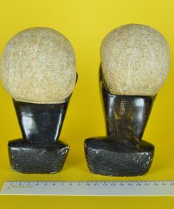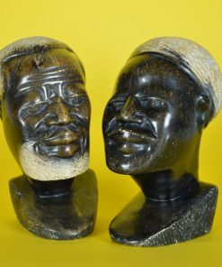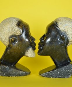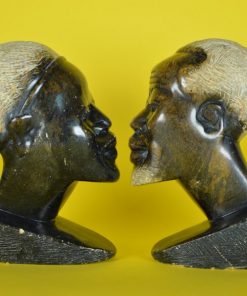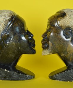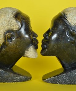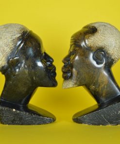 Twee uit steen gehakte markante en gepolijste gezichten van een Afrikaanse man en vrouw. Het paar kijkt elkaar liefdevol aan. Heerlijk om naar te kijken. Het materiaal is gepolijst en gepoetst, met uitzondering van haar en baard. Kijk voor de overige beelden hieronder bij de aangeraden objecten.