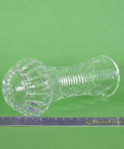 Schitterend vaasje van kristal met een bol buikje. De ingeslepen versiering bestaat uit drie rijen horizontale strepen en drie rijen van vier facet geslepen sterren met daarin drie ondoorzichtige cirkels.