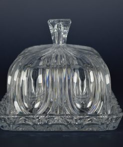 Prachtige strak vormgegeven botervloot. Het glazen boterschaaltje staat op een verzilverde schotel. De verzilverde deksel heeft een greep. Aan de onderzijde gemerkt met één merkteken onduidelijk welk. Geproduceerd rond 1945.