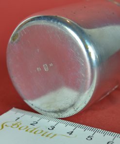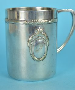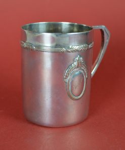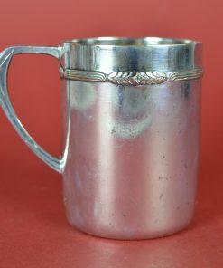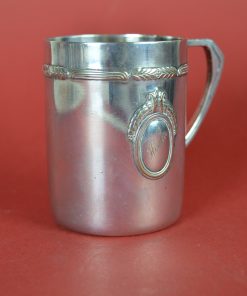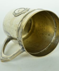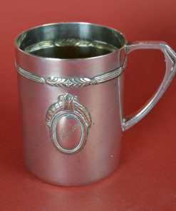 Prachtige verzilverde geboortebeker met in de cartouche de naam Hinka ingegraveerd. Gedecoreerd met lauwerkrans en een fantasierand. Het prachtige Art Nouveau oor doet ook denken aan de empire stijl. Vermoedelijk geproduceerd rond 1910. Aan de onderzijde een aantal stempels, waaronder WMF, en I/O en OX.