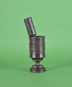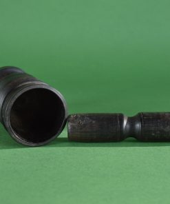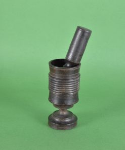 Prachtige strak vormgegeven middeleeuws aandoende antieke apothekers vijzel met donker patina. De vijzel is gemaakt met behulp van een houtdraaibank.