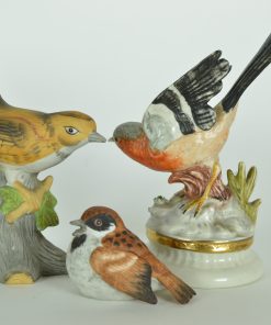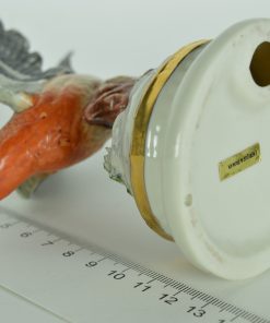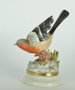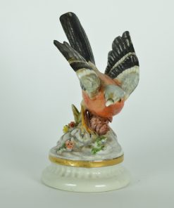 Prachtig beeldje van een vinkje met oranje borst, gestreepte vleugels en zeer gedetailleerd weergegeven pootjes en snavel. Hij of zij is zojuist geland op rotsachtige grond met bloemen. De ronde sokkel is gedecoreerd met een gouden rand.