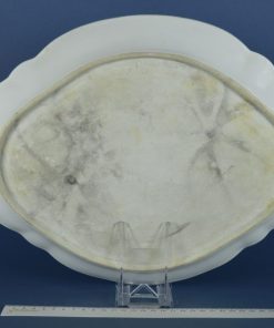 Grote, oude vuurvaste schotel van keramiek. Aan de bodem van deze praktische witte schotel met groene en gouden biezen is te zien dat hij op gaspitten heeft gestaan. Het warm houden van gerechten in deze grote schotel op een gaspit is geen enkel probleem en ziet er ook nog super leuk uit.