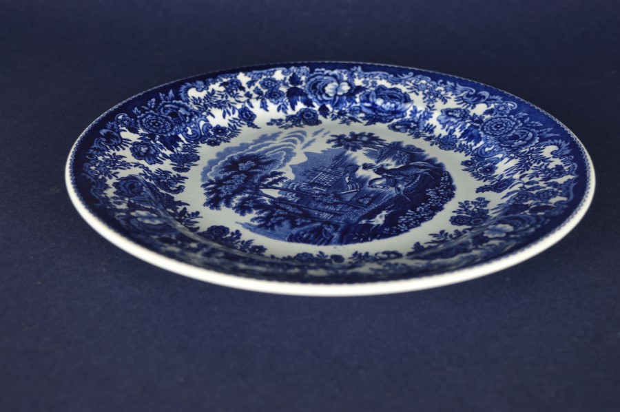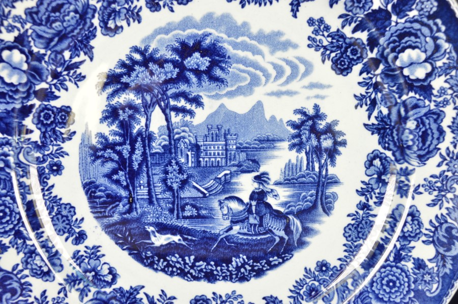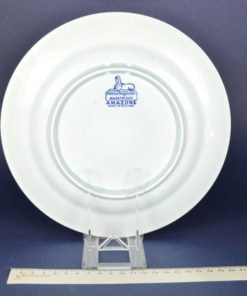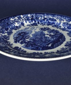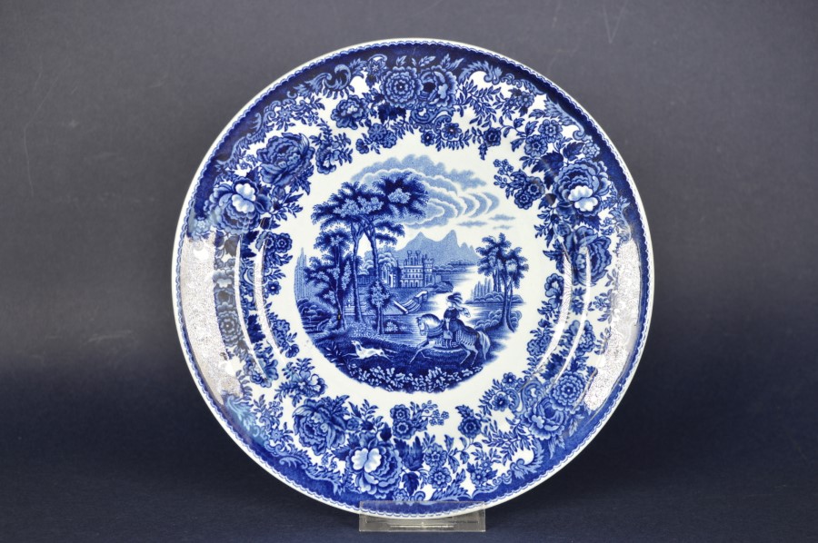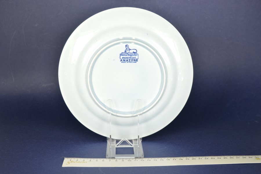 Prachtig wandbord in de lijn Amazone, met een tafereel van een amazone, een vrouwelijke ruiter in een renaissance landschap met op de achtergrond een kasteel en bergen. Zij volgt een hond. Een guirlande van bloemen in diep blauw decoreert de rand. Het bord is antiek en dateert van 1865. Aan de achterzijde een blindstempel en een stempel van Petrus Regout.