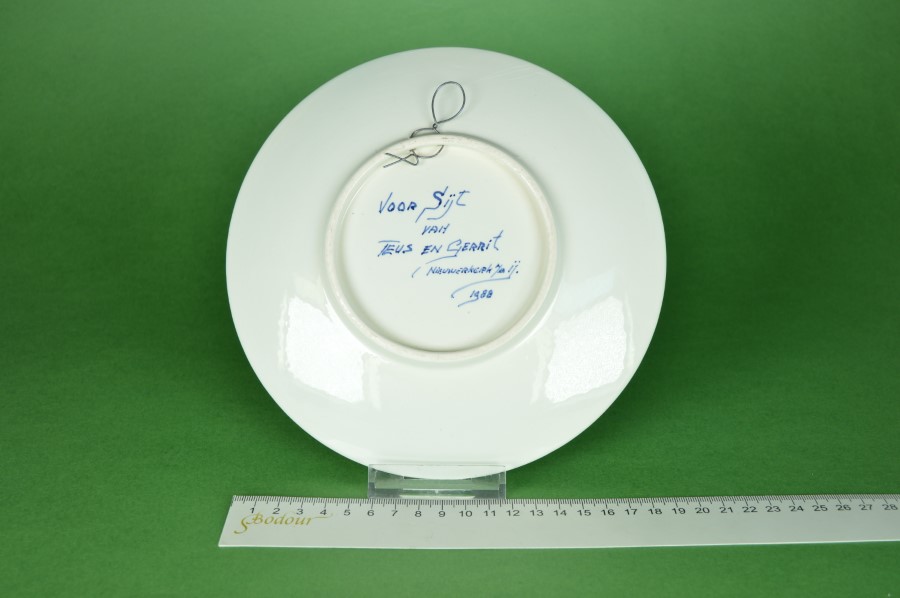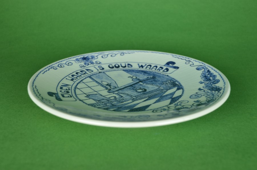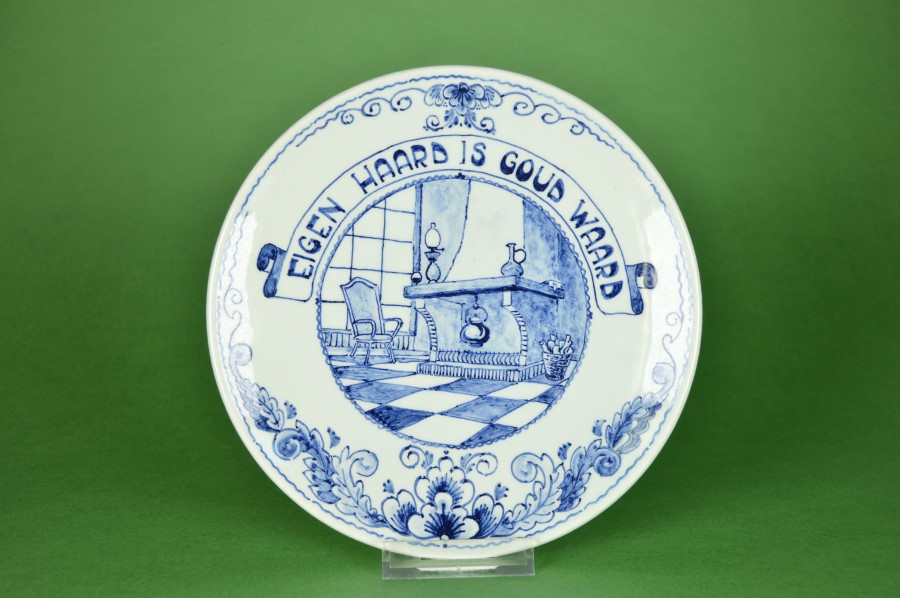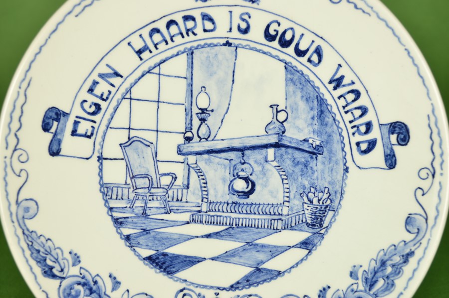 Prachtig uniek handbeschilderd wandbord met het Hollandse spreekwoord: ‘Eigen Haard is Goud waard’. Het toont in de stijl van Royal Delft bloemen in de rand. In het centrale deel een oudhollands tafereel, een kamer met hoge ramen, een vloer met zwart en witte tegels en een stoel. In de open haard hangt een waterketel boven het vuur. Op de schoorsteenmantel een olielamp. Aan de achterzijde de tekst: Voor Sijt van Teus en Gerrit, Nieuwerkerk aan de IJssel, 1988.