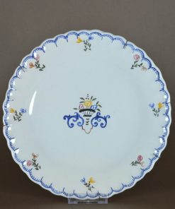 Handgeschilderd wandbord in Franse stijl. De voorstelling toont een bloemenmandje op een ornament. De geschulpte rand wordt benadrukt door de decoratie in blauw met daaronder een rand van gestileerde bloemetjes in blauw, geel en rood. Aan de onderzijde gemerkt met een zeilbootje.