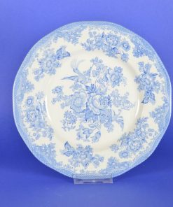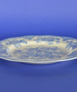 Bijzonder Delfts blauw wandbord uit 1915, uitgegeven vanwege de Eerste Wereld Oorlog. De spreuk op het bord geeft ons in die oorlogsjaren de boodschap; ‘Houdt moedig zee’. Aan de achterkant diverse merktekens en een porselein blindmerk. De afbeelding toont twee personen in een zeilscheepje op een woelige zee met 1915 in het zeil. De rand van het bord heeft een guirlande van okerkleurige blaadjes, of appeltjes van Oranje? Vervaardigd door de Porceleyne Fles in Delft. Zie ook: https://www.utrechtaltijd.nl/bekijken/detail/museum-flehite_1976-003