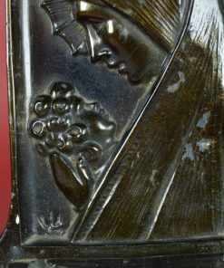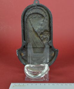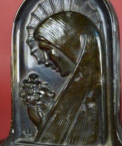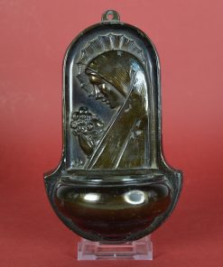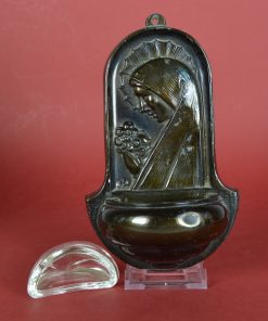 Dit bijzondere, prachtig gestileerd vormgegeven wijwaterbakje, toont moeder Maria met Jezus als peuter met een bos krullend haar. Vormgeving en materiaal wijzen op een productiejaar rond 1920. Het kan aan de muur bevestigd worden en heeft een glazen binnen bakje om het metaal te beschermen tegen roest. Gesigneerd onder de hand van Maria.