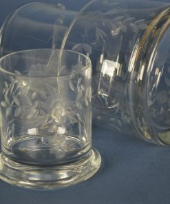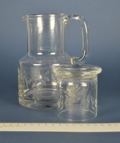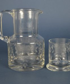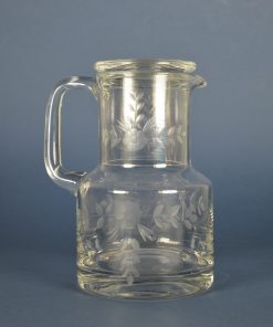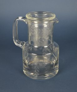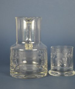 Prachtig glazen karaf, met ingegraveerde bloemen en blaadjes. De strak vormgegeven en toch door de decoratie romantische karaf heeft een bijpassend drinkglas met dezelfde versiering. Het handvat is hoekig. Het omgekeerde glas valt binnen de rand van de karaf en zorgt daardoor dat de inhoud van de karaf helder en schoon blijft.