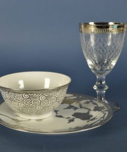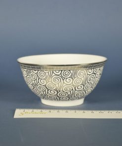 Set van zes feestelijke witte schaaltjes met zilverkleurig krulmotief en zilverkleurige bies met meander patroon. Het formaat van de schaaltjes is prettig voor een klein voor- of nagerecht.