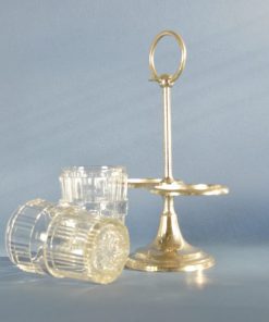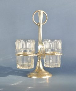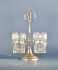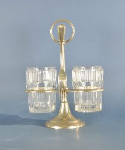 Stak vormgegeven Art Deco zuurstel van fonkelend kristal in een metalen houder. De ruime kristallen bekers zijn prachtig om zilveruitjes, augurken en olijven of voor hagelslag en servetten in te presenteren. De vorkjes op de foto zijn elders op de site te vinden.